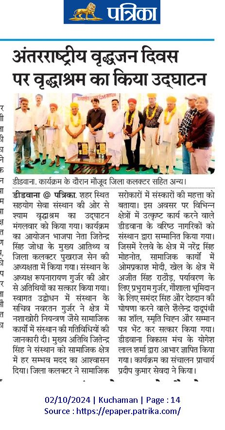 Under the state government's old age home operation rules, the institution established the Shri Shyam Old Age Home in Didwana in 2024.